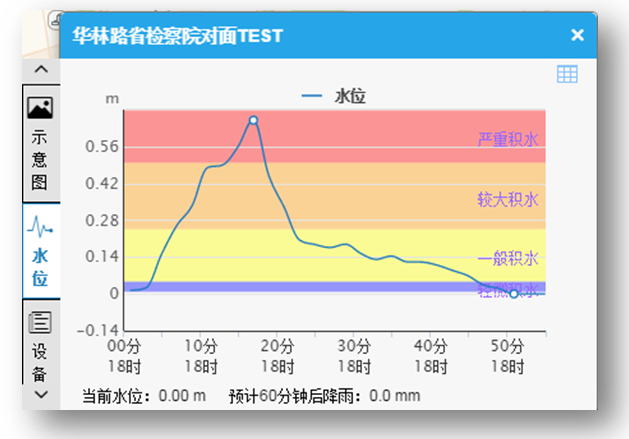 結合GIS地圖平臺,在實時監測信息浮動的基礎上,提供監測信息過程趨勢分析功能。分析結果結合不同要素業務特點及需要,通過過程線方式展示。為用戶掌握積水監測信息的過程演變趨勢提供直觀的信息服務。